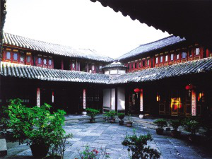 云南大理市喜州“四合五天井”院落。白族將一幢三開(kāi)間二層的房屋稱為“一坊房子”。一坊房子是普通百姓最常見(jiàn)的住房,即底層三間一明兩暗,明間為堂屋,安設(shè)六扇花格門。兩側(cè)次間為臥室,設(shè)單扇門和格扇窗,前面有臺(tái)階和寬敞的廈廊。樓上三間敞通,一般不隔間,依房柱分區(qū)域,面對(duì)天井設(shè)格扇窗。中間明間靠后墻設(shè)神龕,里間當(dāng)書(shū)房,放書(shū)柜和書(shū)桌,人口多的也放床當(dāng)臥。