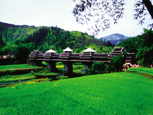 程陽(yáng)永濟(jì)橋始建于民國(guó)初年,集橋、亭、閣、樓、臺(tái)于一身。橋墩石塊砌成六面柱體,墩上設(shè)兩層原木托架梁,托架上建有5座塔閣式橋亭和19間橋廊。橋廊為木結(jié)構(gòu),上覆琉璃泥瓦,對(duì)稱分布,中間為六角攢頭重檐亭。整座橋和諧得體,如游龍翹首,鳳凰展翅。它與我國(guó)的趙州石拱橋、瀘定鐵索橋、羅馬尼亞鋼梁諾瓦沃橋并稱為世界四大歷史名橋。