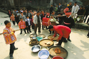 我們尾隨著娶親隊(duì)伍進(jìn)寨,發(fā)現(xiàn)寨子中間的路上也擺著很多簸箕、臉盆之類的容器,原來(lái),村民們也要“討賞”呢!聽(tīng)高邦寨的村支書(shū)說(shuō),遇到這種情況,路人放的東西越貴重,娶親隊(duì)伍留下的肉食就越豐盛,有時(shí)甚至?xí)畔乱徽浑u或鴨呢!