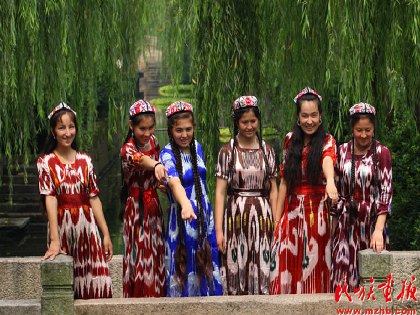如果說苗族服飾是苗族的一部“無字史書”的話,那新疆維吾爾族的艾德萊斯綢和小花帽則是維吾爾族熱情奔放性格的集中體現(xiàn)。艾德萊斯綢質(zhì)地柔軟,輕盈飄逸,非常適合縫制夏裝。按顏色分為黑艾德萊斯、紅艾德萊斯、黃艾德萊斯和多色艾德萊斯。紅艾德萊斯綢圖案為紅色,底色用黃色或白色,富于青春氣息,深受姑娘和少婦的喜愛。黃艾德萊斯綢圖案為黃色,在各種底色的襯托下顯得莊重而典雅,顯示一種富貴氣息,一般在制成中青年婦女服裝的時候使用。綠艾德萊斯綢多用來縫制學(xué)齡前兒童的女裝。維吾爾族無論男女老幼,不分春夏秋冬,都喜歡戴一種維吾爾族語稱為“朵巴”的小花帽,制作小花帽運(yùn)用絲線平繡、絲線結(jié)繡、串珠片繡、格子架繡、盤金銀繡、十字花繡、鉤花刺繡、扎絨刺繡以及刺、扎、串、盤等技法,將花卉果實等圖案匯集在帽子中,使小花帽的顏色豐富多彩。