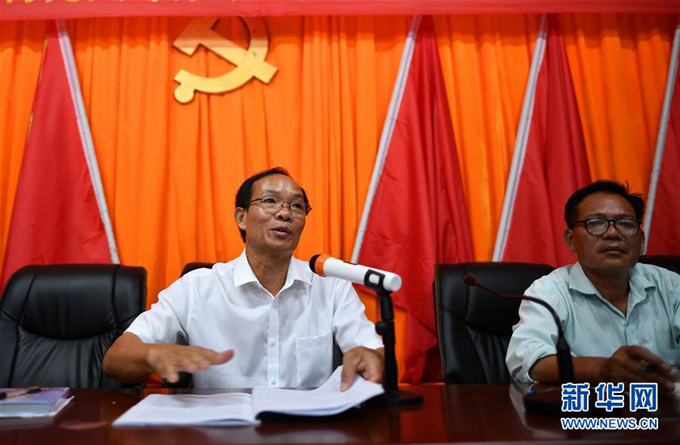 2017年9月28日晚,羊風(fēng)極(左)在海南省白沙黎族自治縣打安鎮(zhèn)田表村村委會組織黨員進(jìn)行“兩學(xué)一做”學(xué)習(xí)教育活動