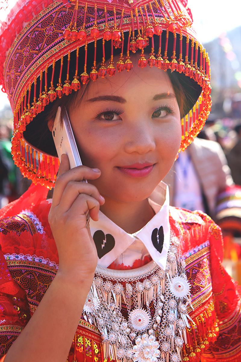 由于在歷史上經(jīng)歷長時(shí)間、大范圍的遷徙,苗族文化形成了較強(qiáng)的環(huán)境適應(yīng)能力和流動(dòng)變遷特征。節(jié)日作為民族文化的凝集點(diǎn),慶祝方式和形態(tài)也處于動(dòng)態(tài)的演變和傳承之中。在大布紅的花山場,一個(gè)從老撾過來的苗族女子樂隊(duì)讓當(dāng)?shù)氐拿缱迦烁械胶闷妗f著同樣的西部苗語,卻穿著略顯不同的衣服。她們排成一行,教人們一來一往地扔繡包,一時(shí)間圍觀者無數(shù)。不消多久,女子樂隊(duì)手中的CD就在人群中銷售一空。