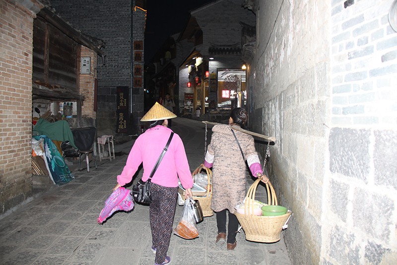 晚上7點多鐘,一群在小河里撲騰了一天的鴨子排著隊憨態(tài)可掬地回到寸家灣巷口,忙碌一天的人們也開始回家。我正擔(dān)心晚上約定的采訪找不到地方,卻在圖書館旁邊的小巷里碰到了收工回家的姜聰留。她今天的松花糕賣了一板半,收入100多元。同行的一個姐妹幫她挑著擔(dān)子,姜聰留自己提著袋子和板凳,一路無語。臨近家門的路口,姜聰留從姐妹肩上接過擔(dān)子,眼神默契相視后,各自回家——這就是她們的生活。晚飯姜聰留到丈夫的大哥家吃土鍋子,兩家的院子只隔一墻,我也跟著進(jìn)了大哥江宗良的家門。