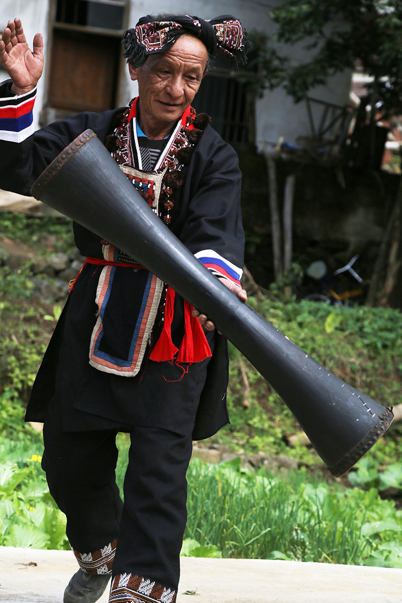 聽罷門唻歌,再賞羊角長鼓舞。轉(zhuǎn)鼓、跨步、收腿、回腰、碰角……這套由多人合作的舞蹈,動(dòng)作粗獷,節(jié)奏明快,舞者配合默契,音韻鏗鏘。今年66歲的老藝人盤福貴,舞起祖宗留下來的已有一百多年歷史的羊皮長鼓,身手矯健、動(dòng)作敏捷,讓人驚嘆不已。盤福貴的爺爺、父親都是跳羊角長鼓舞的高手,父親把這項(xiàng)技藝傳授給他,如今他又收女兒和孫子為徒,已是五代傳承了。