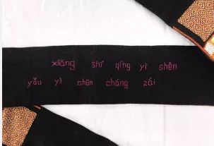 在北京服裝學(xué)院民族服飾博物館藏的這條白褲瑤男子盛裝腰帶的背面,就繡有“相識(shí)情義深,友誼春常在”的拼音,也許就是一對(duì)白褲瑤青年男女的愛情密碼。