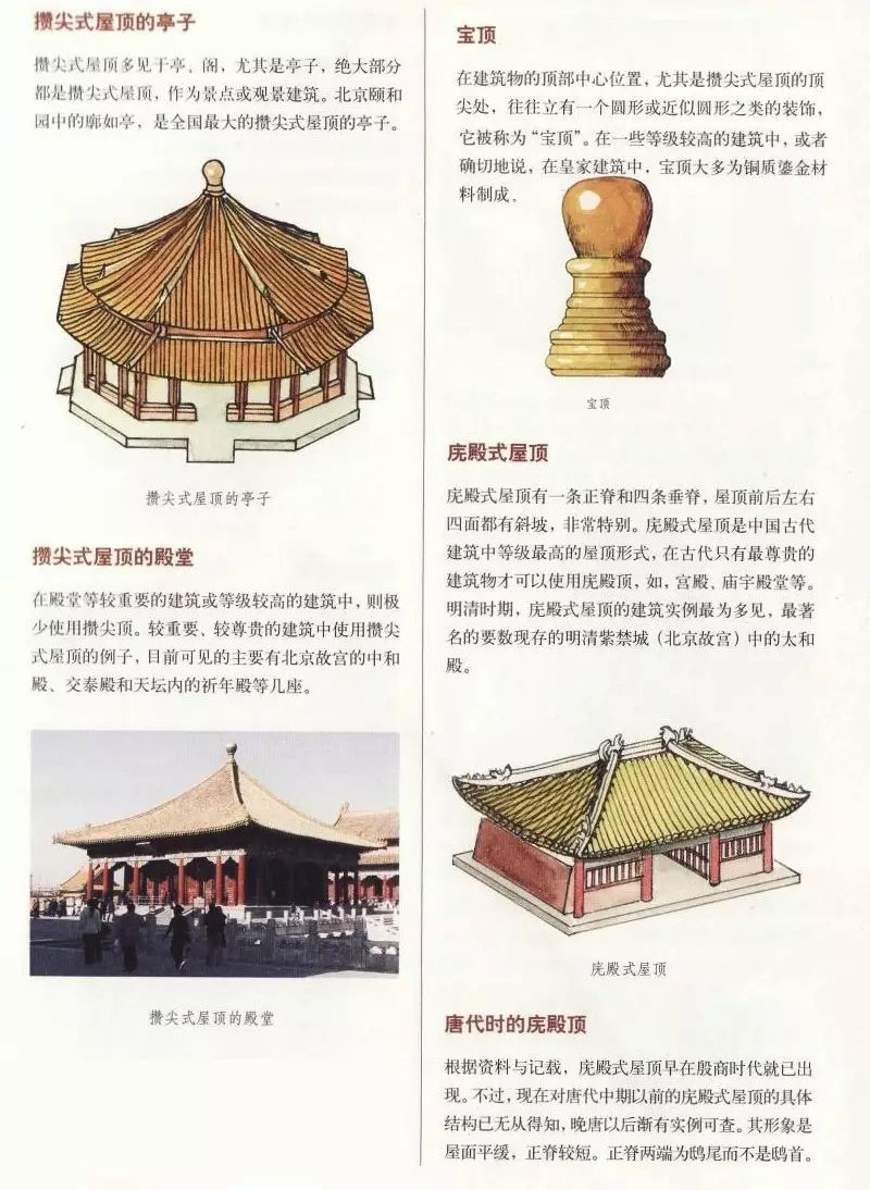 無正脊,只有垂脊,只應用于面積不大的樓、閣、亭、塔等,平面多為正多邊形及圓形,頂部有寶頂。根據(jù)脊數(shù)多少,分三角攢尖頂、四角攢尖頂、六角攢尖頂、八角攢尖頂。此外,還有圓角攢尖頂,也就是無垂脊。攢尖頂多作為景點或景觀建筑,如頤和園的郭如亭、麗江黑龍?zhí)豆珗@等。在殿堂等較重要的建筑或等級較高的建筑中,極少使用攢尖頂,而故宮的中和殿、交泰殿和天壇內(nèi)的祈年殿等卻使用的是攢尖頂。攢尖頂有單檐、重檐之分。