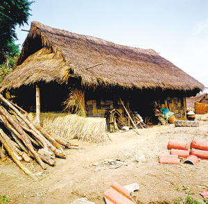 臨滄地區(qū)的耿馬縣芒洪鄉(xiāng)也是布朗族的聚居區(qū)。房屋以草頂居多,也有蓋竹瓦的。三開間居多,門在正中,左邊是火塘,是就餐待客和睡覺的地方,右邊放糧食雜物。房屋為木柱結構,縱向框架。大柱立于兩山墻中間,柱腳深埋地下,柱高依屋脊高度而定,柱頂以天然枝杈承托脊檁。以同樣的方法在四角各立頂端帶枝杈的柱子,柱高以屋檐的高度而定,承托邊檁。這樣6根木柱、3根檁木構成了主要承重的縱向框架,也形成了雙斜面屋頂。在大柱間密栽小柱,小柱間再橫向綁扎竹片,從地面到柱頂形成密密麻麻的小方格子,這就是墻壁的骨架。然后把和了黃泥漿的長草把一綹綹、均勻地掛到竹片上,將里外抹平,干后就成了“掛”著的草泥墻。