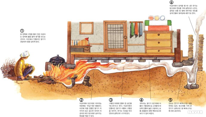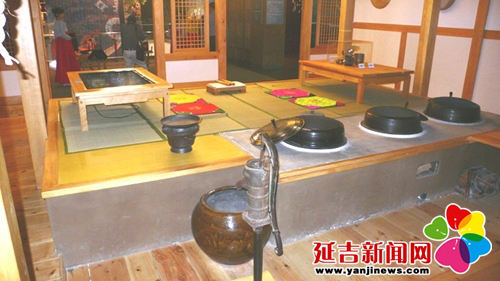 在傳統(tǒng)的朝鮮族民宅中,炕和鍋臺(tái)是平齊的,需要燒火做飯時(shí),主婦會(huì)打開架在柜臺(tái)一側(cè)的移動(dòng)木板,下到地面水平線以下的“灶坑”點(diǎn)火做飯。傳統(tǒng)的炕采用長(zhǎng)筒式結(jié)構(gòu),煙火由一洞內(nèi)循環(huán)排出,使每洞都有煙火串入,炕即溫?zé)?。朝鮮族的火坑高度為30-40厘米,但炕洞向下挖入,炕面抹白灰,表面糊油紙或鋪草簾子,炕面平整。隨著物質(zhì)條件的改善,炕面改鋪纖維板或者地板膠,既美觀又耐用。