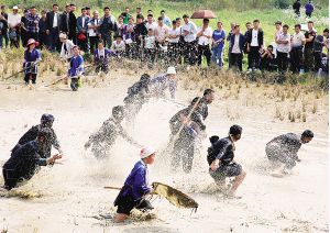 村民在稻田里撈“社魚”。