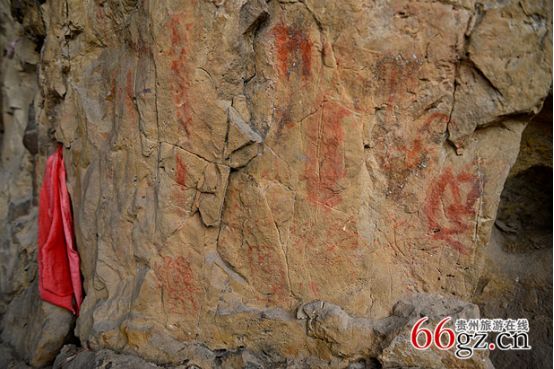 同時(shí),在金山洞壁上的清代壁題也數(shù)量眾多,既有題詩,又有紀(jì)事,還有祝文,分別題于清乾隆、道光、咸豐年間。明顯可見“貴州貴陽府”和“貴陽府廣順州”等字樣。還有1949年以后的毛主席語錄,均以赭色書寫。據(jù)說時(shí)至今日,仍有村民在巖下洞口焚香秉燭,寄拜巖神,祈禱康健。現(xiàn)在在巖石上還能看到祈福的紅布和被煙火熏黑的巖洞。