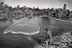在伊犁河邊撒網(wǎng)的男子
