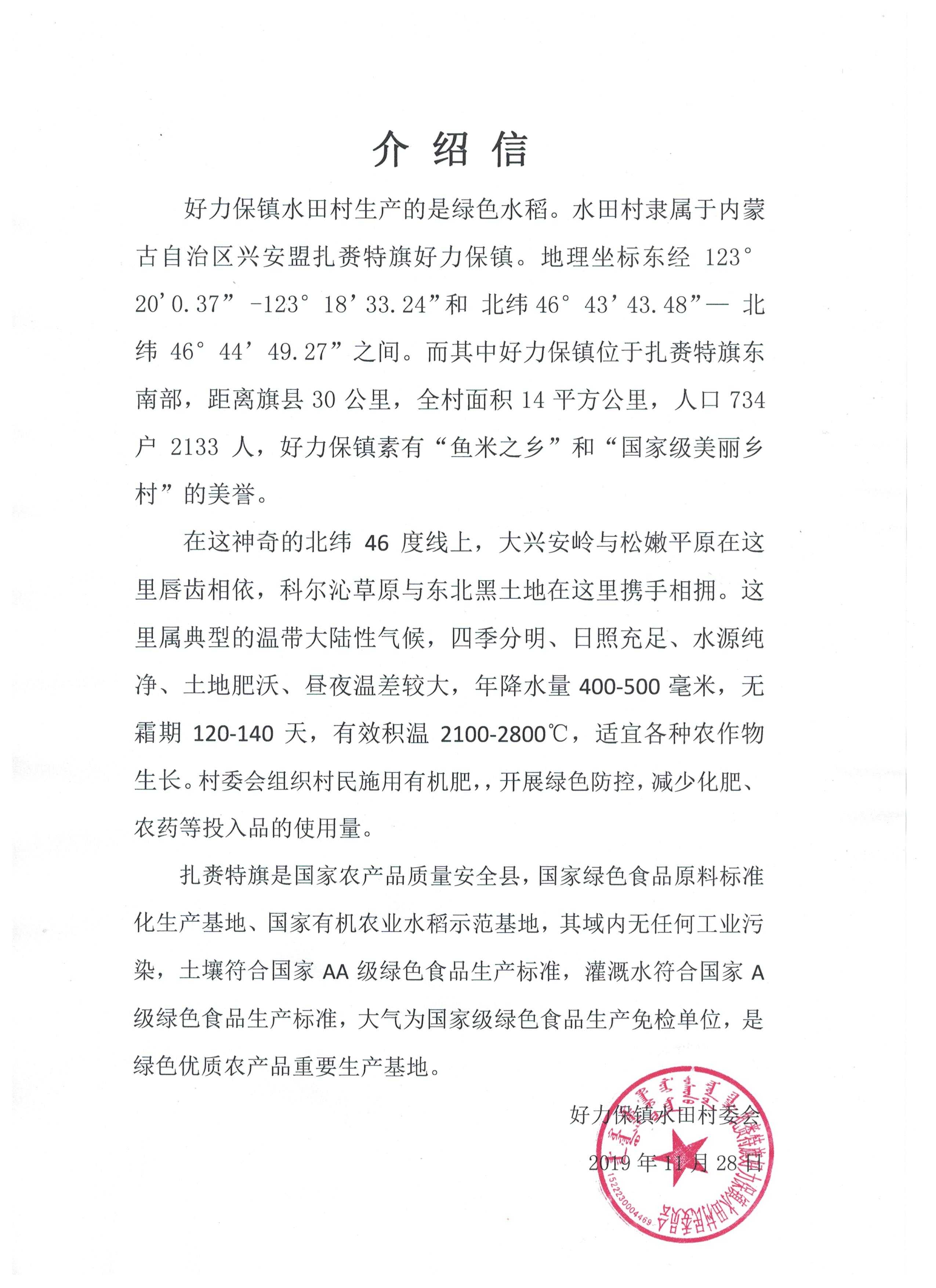 蒙古屯村屬好力保鎮(zhèn),沿綽爾河岸而建,水田較多,祖輩種植水稻。蒙古屯村的土壤以黑土為主、土質(zhì)肥沃,全年積溫在2600到2700攝氏度左右、并且早晚溫差較大,有利于水稻中有機物的積累。綽爾河水充足時,可以滿足沿岸灌溉需求;河水流量較少時,蒙古屯村自有的機井也可以滿足種植所需的水量。