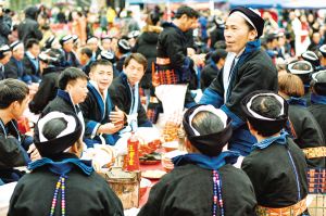 每逢重要節(jié)日,白褲瑤群眾都有舉辦長席宴的習(xí)俗。以前,芭蕉葉當(dāng)作盤子,芭芒干折成筷子,一個飯團(tuán)、一塊牛肉,再加一碗酒,就是長席宴的全部?,F(xiàn)在改變了很多,但不變的是白褲瑤自然、和諧、平等的美德。2019年2月拍攝。