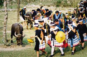 白褲瑤的喪葬習(xí)俗十分獨(dú)特,整個葬禮悲壯、肅穆,氣氛凝重莊嚴(yán)。參加葬禮的親友依次排隊順時針繞牛一圈,緬懷逝去的親人。2007年10月拍攝。