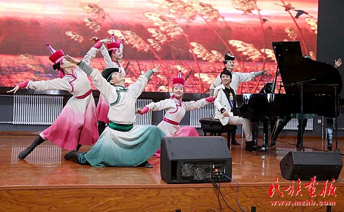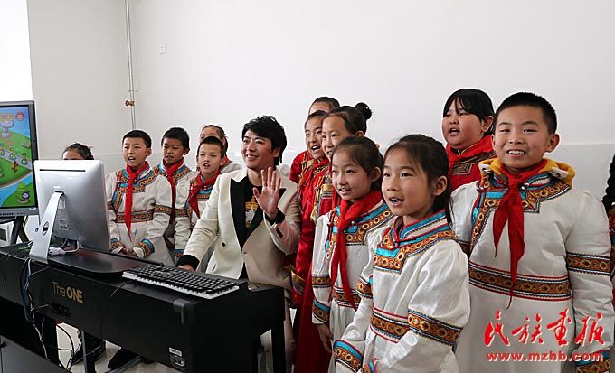 在“快樂的琴鍵”音樂教室捐贈儀式上,朗朗與內(nèi)蒙古藝術(shù)劇院直屬烏蘭牧騎演員聯(lián)合表演了《鴻雁》。