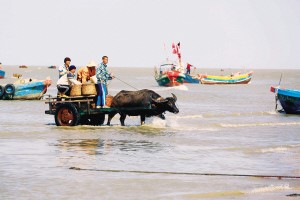 疍家漁民在海上用牛車(chē)運(yùn)送漁獲漁具(2013年攝)。