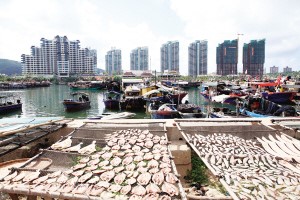疍家人晾曬海魚(yú)的對(duì)面聳立著一座座高樓(2007年攝)。