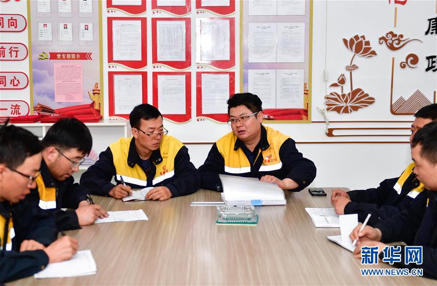 1月11日,在青藏鐵路望昆站,于本蕃(右三)召集工友開(kāi)會(huì)商定施工方案。
