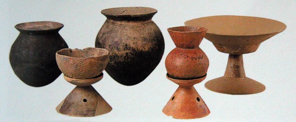 彌生時(shí)代的名稱,源自1884年東京市本鄉(xiāng)彌生町“彌生陶器”的發(fā)現(xiàn)。彌生陶器與繩紋陶器截然不同,為素面,灰色。日本人認(rèn)為彌生陶器是“渡來人”制造的?!岸蓙砣恕笔侵袊箨懲ㄟ^朝鮮半島而來,他們帶來了陶器的制作技術(shù)。彌生陶器為深釜器,以甕形器、缽形器、高腳杯(豆形器)為主(圖五)。
