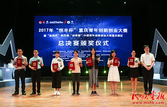 鐘億靈(右二)參加重慶市創(chuàng)新創(chuàng)業(yè)大賽并榮獲一等獎(jiǎng)。