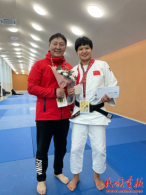 烏日根桑格(左)隨國家柔道隊參加 2021年世界柔道大滿貫比賽。圖為與國際級運動健將、國家柔道隊隊員楊俊霞合影留念。