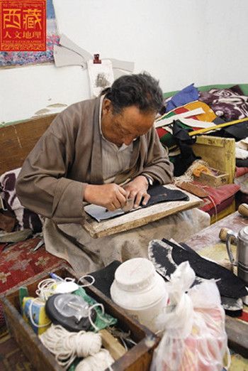 坐在工作臺(tái)上的赤列塔青,身材高大,穿一身合體的淺色藏裝,前擺上沾著幾星鼻煙,長(zhǎng)期用針的手指有些變形。翻開(kāi)他的履歷發(fā)現(xiàn),赤列塔青可以說(shuō)是拉薩少有的制靴世家,他的父親邊巴頓珠在舊社會(huì)是個(gè)給人支差的貧苦鞋匠,靠給有錢人修鞋、做鞋為生。今年68歲的赤列塔青性格沉穩(wěn)、做事穩(wěn)健,他12歲當(dāng)學(xué)徒工,做鞋做了56年,如果再加上父輩的修鞋歷史,時(shí)間更長(zhǎng)。在今天的拉薩有這樣經(jīng)歷的人算是屈指可數(shù)了。赤列塔青從小就在父親和師傅身邊打下手,逐漸掌握這個(gè)足以養(yǎng)家糊口的一技之長(zhǎng),終于成長(zhǎng)為一個(gè)勤奮而多才的手工藝人,開(kāi)始了穩(wěn)坐一隅的匠人生涯。