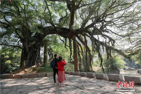 2020年10月,游客在廣西昭平縣的黃姚古鎮(zhèn)內(nèi)參觀古榕樹(shù)。中新社記者 賈天勇 攝