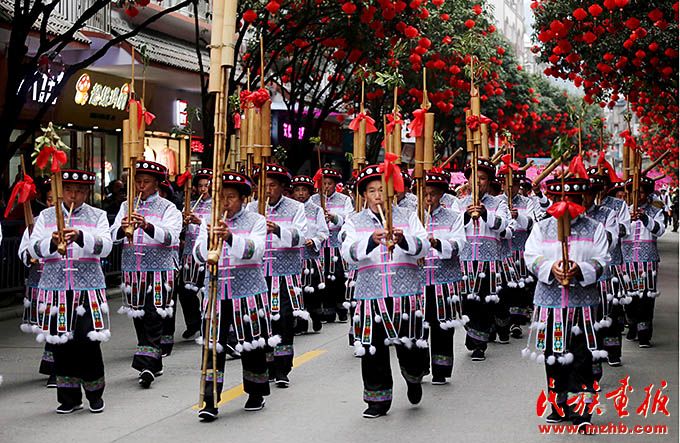 苗族同胞婚俗游行展示。