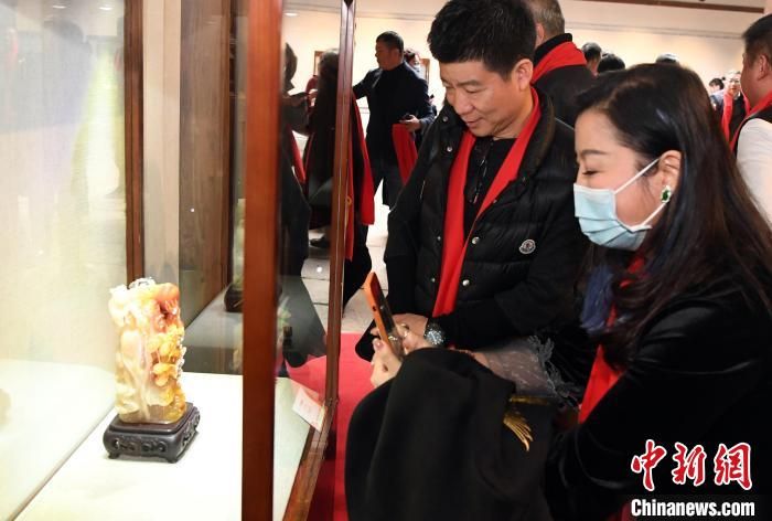 中國工藝美術(shù)大師葉子賢壽山石雕傳承展吸引觀眾觀看。 記者劉可耕 攝