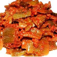 把鹽漬好的青菜削去老葉、粗皮,用甜酒、糖拌勻,再按比例加入蒜苗、蒜頭、辣椒粉、冰糖、食鹽和適量白酒,調(diào)好后分壇包裝,密封貯存。約兩個(gè)月后即可出廠銷售。