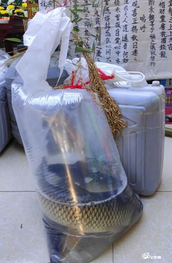 這幅圖片拍攝于都勻殯儀館,是在一位水族干部的葬禮上,三都水族自治縣九阡鎮(zhèn)的內(nèi)侄們從家鄉(xiāng)趕來憑吊姑父時(shí),送來了三條大活魚、一頭小豬、一壺米酒等物。水族有忌葷不忌魚的習(xí)俗,內(nèi)侄送魚表示與表兄弟姊妹一道忌葷,共同戴孝,共同守制;送來的小豬為堂祭犧牲,祭奠亡人。