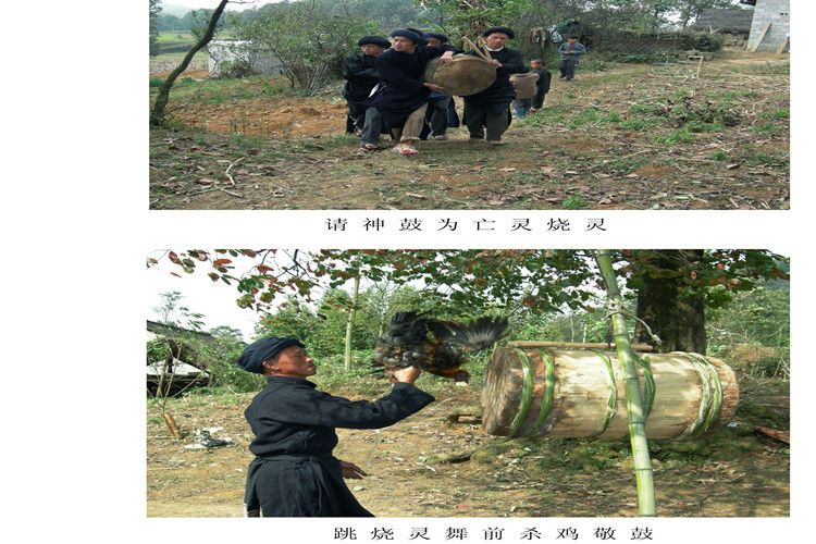 據(jù)苗族民間傳說,楊魯(指苗族祖先)死后,為祭奠他,苗族人民就用楊魯從玉皇大帝那里帶回來的木鼓和蘆笙為他做齋,鳴鼓三聲,吹奏蘆笙震天動地,接楊魯回來燒靈,因此鼓和蘆笙成為苗族人民辦喪事的信物,是神靈的象征,以鼓配唱,以鼓配笙吹跳,久而久之形成了苗族祭祀祖先和為亡靈燒靈開道的祭祀性舞蹈——“燒靈舞”。遠(yuǎn)古時期,苗族是比較強大的民族,苗族的喪葬習(xí)俗,一直受著鬼神觀念的影響,并在意識形態(tài)深處,打下了深刻的烙印。由此可知,苗族“燒靈舞”源遠(yuǎn)流長,以口傳心授方式代代相傳。