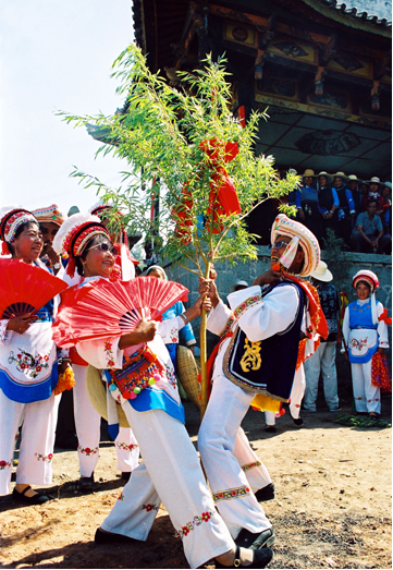 “繞三靈”活動的特點,除了向本主神靈祈求風(fēng)調(diào)雨順的內(nèi)容之外,主要在于其歌舞活動所表現(xiàn)的男女情愛無所顧忌,放達(dá)不拘。每個歌舞隊列領(lǐng)頭者均為男女巫二人,他們以一手共執(zhí)一株齊人高的樹枝,另一手分別揮舞牦牛尾和花手巾,邊舞邊唱,引領(lǐng)著隊伍緩緩前行。樹枝上掛著紅綢系著的葫蘆,據(jù)說葫蘆象征母腹,紅綢象征陰血。他們口唱的調(diào)子稱“活恩枯”直譯為“花柳曲”,一唱一和,幽默風(fēng)趣。其后的歌舞隊列,唱的也都是充滿艷情的調(diào)子,跳的是霸王鞭和八角鼓舞,舞姿多有男女背靠背、心合心、腳勾腳等形式,無拘無束地表達(dá)著熾熱的情感。