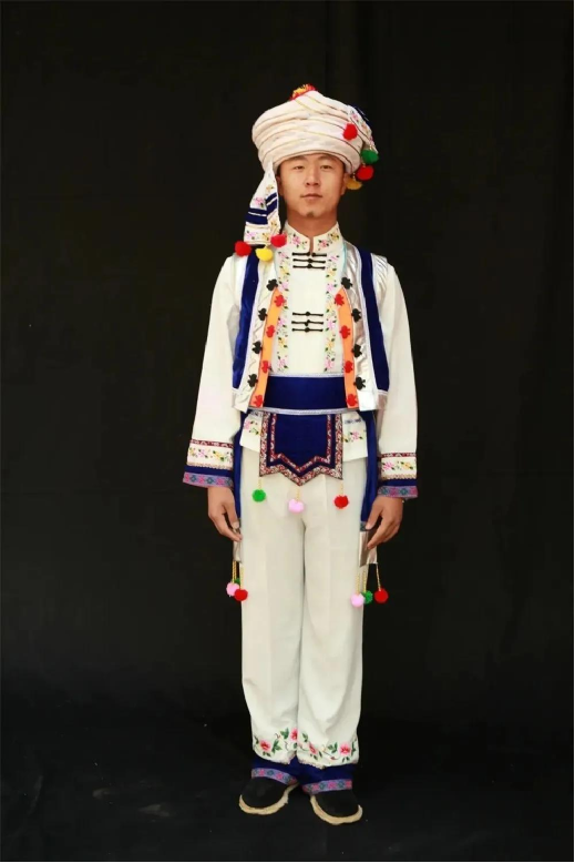 白族有著尚白的傳統(tǒng),白族男子喜纏白色或藍色包頭,多穿白色對襟上衣,外套黑領(lǐng)褂,下身穿寬筒褲,系拖須褲帶,腳穿剪刀口布鞋,有的還佩帶繡有美麗圖案的掛包,顯得敦厚英俊,灑脫大方。