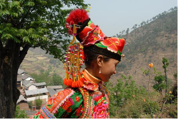 云南巍山彝族回族自治縣各民族如壯麗的織錦,將生活裝扮得五彩繽紛,充滿詩(shī)情畫意。其中特別是東山一帶的彝族服飾色彩較為豐富,款式變化多姿,并且以大量的銀制品和刺繡裝飾,制作工藝之精良,堪稱少數(shù)民族服飾一絕。以小孩帽而言,就有魚尾帽、小瓢帽、銀鼓帽、花帽和搭耳帽等數(shù)十種,名目繁多,式樣各異。帽子上都繡有花草、樹葉、龍鳳圖案,鑲嵌著閃亮的銀首飾,十分逗人喜愛(ài)。小孩的衣服式樣也很多,大多由紅、藍(lán)、綠、白幾種顏色的布料縫制而成,紅綠交織,藍(lán)白相襯,非常艷麗。如花朵一般的彝族少女通常頭戴銀鼓帽,墜耳環(huán)、身穿藍(lán)領(lǐng)褂,腰系花圍裙,下著綠彩褲,背掛圓裹背。銀鼓帽和繡花鞋做工極為精巧,全套裝飾花團(tuán)錦簇,恰似一只開屏的孔雀。結(jié)婚后的婦女就不再戴帽子,改為結(jié)發(fā)髻,裹包頭。發(fā)髻一般呈寶塔狀,外裹黑紗和黑布包頭,發(fā)髻上戴“別子”?!皠e子”其實(shí)就是發(fā)卡,均為銀制品,分為四串,每串有兩個(gè)燈籠繡球,兩個(gè)響鈴和兩尾小魚。包頭巾外再用銀串珠、亮球飾之。上衣著右衽大襟,前短后長(zhǎng)、領(lǐng)、袖及襟邊則鑲以多層不同的金銀絲瓣或自繡花紋的多層寬窄不同的花邊。外罩齊腰藍(lán)布短領(lǐng)褂,領(lǐng)口上安裝著七個(gè)用銀鼓釘湊成五個(gè)葉子,狀如葵花形,彝語(yǔ)叫“披巴”的裝飾。領(lǐng)褂四周皆用銀鼓釘鑲邊,共四排,每排36顆。一件領(lǐng)褂上需有兩百多顆銀鼓釘,加上胸前佩戴銀制的“三須”針筒,“菱角吊”串珠和雞心型繡花荷包,整個(gè)裝飾真是銀裝素裹,分外嬌嬈。腰間系的圍腰布上,鑲嵌多層金銀絲瓣或自繡圖案的花邊。圖案有串枝蓮、牡丹花、太陽(yáng)花及鳳戲牡丹、丹鳳朝陽(yáng)等。無(wú)論未婚和已婚婦女,背上都有一個(gè)用羊毛搟制而成的圓型繡花裹背,直徑約一尺不等,內(nèi)外兩層,中可承物,上繡兩對(duì)太陽(yáng)花,一大一小,對(duì)稱排列。裹背除用作裝飾外,還可保護(hù)腰部,既有欣賞價(jià)值,又有實(shí)用價(jià)值,這在巍山彝族服飾中是最為典型的一件飾物。銀鼓帽繡有42朵小花,鑲有96顆銀鼓釘,帽頂插有花一朵或釘有櫻花一束。其帽形如金魚,魚頭魚身為帽,魚尾多岔分為護(hù)頸,亦稱為“魚尾帽”。繡花鞋呈船形或鳳頭形,鞋面繡有40余朵小花,紅色中夾有40余片綠葉。如果是新娘鞋,則用紅色或粉色的軟鍛做鞋面,更為講究。