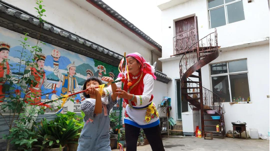 整個慶洞村世世代代都有打霸王鞭的習慣,何松康老師向我們介紹:“霸王鞭是古時白族人民在田間勞作過程中演變而成的舞蹈,舞蹈的手帕好比勞作時擦汗的手巾,霸王鞭好比勞作時手中的鋤頭,這舞蹈來源于天地間,是勞動人民的智慧結(jié)晶”。而何松康所舞的霸王鞭是最傳統(tǒng)的樣式,是由爺爺傳承給媽媽,再由媽媽傳承給自己的。如今,她又將其完完整整傳給了自己的兒媳婦及小孫女。“我自己喜歡打,家里的人也喜歡,幾代人都打霸王鞭,我勵志要好好地傳下去”,何松康說。