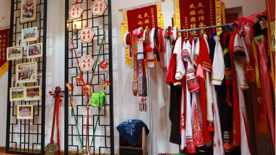 方正的堂屋里掛滿了何松康參加演出、培訓的各種照片及霸王鞭、八角鼓、服裝等演出道具。院子的墻上專門請人繪了一幅霸王鞭的彩繪,旁邊書寫:“弘揚白族傳統(tǒng)文化,傳承民間舞蹈藝術(shù)”。