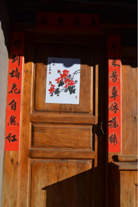 寫春聯(lián)繪年畫的傳統(tǒng)在劍川縣金華鎮(zhèn)由來已久,明朝洪武年間改土歸流和移民屯邊制度的推行,使儒家文化、理學思想逐漸融入邊疆人民的生活。金華古鎮(zhèn)居民受此影響,走上追求仕途功名的道路,文人鄉(xiāng)紳都以顯示儒學身份為榮。每逢春節(jié),人們會邀請有功名的仕子或傳學明經(jīng)的文人來到家中,撰寫對聯(lián),同時根據(jù)時令畫上一兩幅門神畫,希望通過此舉祈愿自家后生求得功名。如今走在金華古鎮(zhèn)西門街上,仍能看到家家種花養(yǎng)草,戶戶楹聯(lián)盈門,一派文風蔚然的生機。