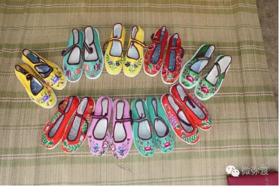 繡花鞋分大口鞋、小口鞋兩種。大口鞋大方素雅,小口鞋古樸艷麗?;佑小胺遐s梅”、“喜鵲登枝”、“獅子滾雪球“、“鳳穿牡丹”和彝族人民結(jié)婚時候,按當(dāng)?shù)仫L(fēng)俗所需必須穿的“毛邊底”等。這些花樣圖案具有不為時代變幻所動的恒久性質(zhì),蘊藏著濃厚的傳統(tǒng)民俗文化。它給予人們的絕不僅僅是絢麗悅目的美感,還是彝民們征服自然,繁衍生息,爭取愛情和歡樂的記錄。