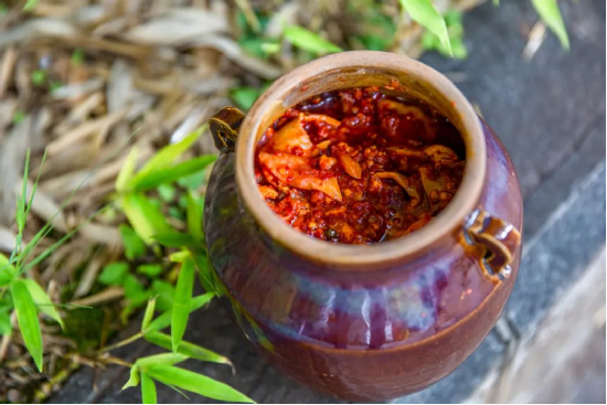 關于鶴慶的滋味,最深刻的記憶還要數(shù)那一小碟紅亮鮮香的豬肝胙。豬肝胙是用新鮮的內(nèi)臟、排骨佐以食鹽、花椒、辣椒、八角、草果等眾多香辛料研制而成的鶴慶特色美食。腌制好的豬肝胙,開壇即可聞到濃重的香氣撲鼻而來,蒸熟下飯,炒菜提鮮,豬肝胙濃郁的滋味都不會令人失望。