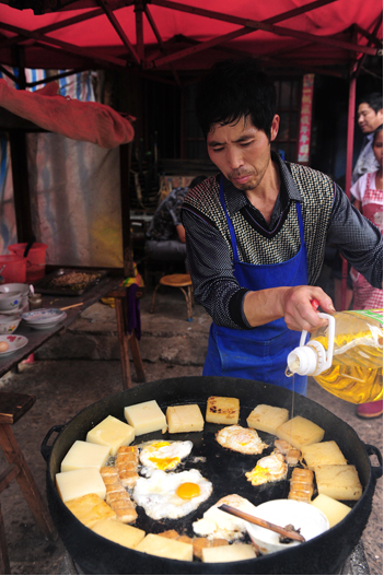 臭豆腐是平壩街的特產(chǎn),一直享譽(yù)滇東南。特別是在文山更是家喻戶曉。它火柴盒般大小,表皮長滿一層白白的絨毛。若是蒸吃,先揀幾塊鋪在碗底,再撒撮鹽巴,放點(diǎn)食油,加些姜絲,放進(jìn)蒸鍋蒸熟。吃前用筷子攪和拌勻,看上去雪白,細(xì)嫩,宛若剛出籠的銀糕玉乳,散發(fā)出誘人的馨香。若用油煎,先將菜油舀進(jìn)鍋里,待鍋熱時(shí),立即放進(jìn)臭豆腐。隨著“嗤”的一聲,香味立時(shí)撲鼻而來,再用小火耐心地將兩面煎黃,薄薄的黃皮內(nèi)含著一包乳漿。看了就讓人垂涎欲滴。