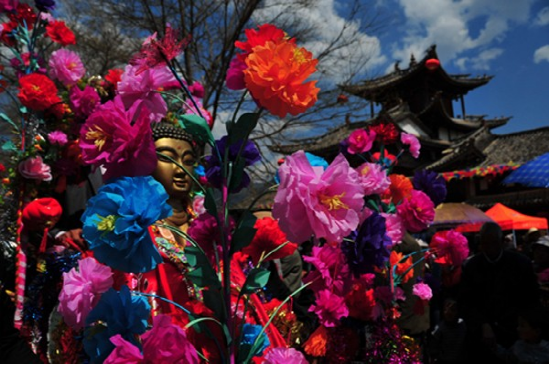 農(nóng)歷二月初六,迎太子入城。這一天在佛教徒的帶領(lǐng)下,人們焚香沐浴,衣冠整齊,虔誠(chéng)地將“太子”(用布扎油漆制成的太子行像)請(qǐng)到行宮或本主廟里。這一年的新郎為太子抬轎,希望能得到太子的保佑而使新婚的妻子孕生男兒。