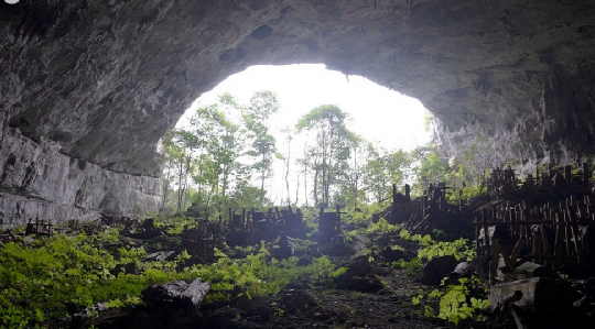 果里巖洞葬位于貴州龍里縣擺省鄉(xiāng)果里村東1公里煤洞坡的洞穴中,地處巖溶山原,峰叢林立,喬灌間雜。該洞在山頂下四十米處呈南北向橫穿山體,長580米,寬為38—65米,高為21—50米,有兩個入口;北面入口,寬54米,高21米,;南面入口,寬35米,高45米,有三道石砌墻垣。洞中地勢內(nèi)斜平緩,洞內(nèi)干燥,能見度好,入口處地勢外斜。據(jù)查,果里的苗族于明朝初期從貴陽遷徙而來。從遷徙之初至清末,他們均習慣將亡者殮于棺木集中存放在洞穴之內(nèi)。在洞穴北面入口3000平方米的范圍內(nèi)現(xiàn)存完好的棺木有192具,腐朽散落及其它原因損毀的約200余具。棺木材質(zhì)為杉木。棺木有平板平頭和鼓型雄頭之分,其大小因亡者的體型而定。平板平頭型棺木制作粗糙,長1.45—2.23米,寬0.46—0.75米,高0.46——0.9米;鼓型雄頭棺木多為杉木本色,長1.5—2.23米,寬0.48—0.8米,高0.5—0.9米。棺木一律頭向北面入口,均固定于兩個或三個“井”字架上;三個“井”字架表明亡者為男性,兩個“井”字架的為女性。棺內(nèi)亡者頭靠凹型木枕。平板平頭棺為明代,鼓型雄頭棺為清代。