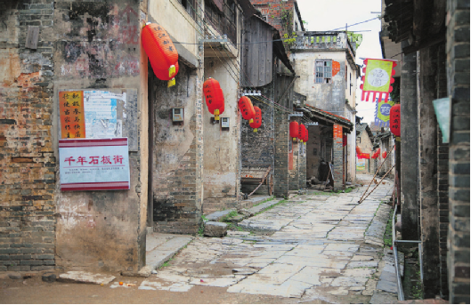 千年老街自北向南,寬約4米、長約300米,青石板路面。沿街多為典型的嶺南風(fēng)格建筑,二層騎樓,房屋寬敞深長,一樓為鋪,二樓為居,前為店,后為廚。天井頂面多設(shè)明瓦數(shù)塊,以取日光照射,木梯扶手、門窗雕刻的粗細(xì)花紋無聲地證明它們?cè)?jīng)的風(fēng)采??吹贸霎?dāng)年舊街果然是繁華過的,有飯館,有劇院,有酒肆,有客棧,有百貨,街道排水、布局都很合理,有的街道至今在門前仍有留有水道。