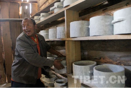 村主任扎巴在整理貨架上的待售石鍋 田春艷 攝