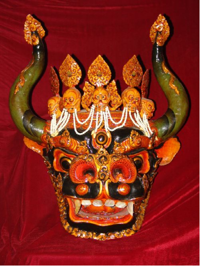 據(jù)普布次仁介紹,早在吐蕃王朝時(shí)期,西藏就有宗教舞蹈羌姆和名為“吉達(dá)吉姆”的歌舞劇?!凹_(dá)吉姆”在演出時(shí)演員要戴上白色面具,其表演的內(nèi)容是請(qǐng)求天神降雨或不要讓本地出現(xiàn)冰雹、刮大風(fēng)等自然災(zāi)害。這種歌舞劇在今天的日喀則地區(qū)仍然存在,人們常將之稱為“抗災(zāi)歌舞”。而在宗教舞蹈羌姆中,面具多數(shù)是根據(jù)佛經(jīng)及寺院殿堂中的塑像制作的,制作手法要求較高,以立體造型為主。