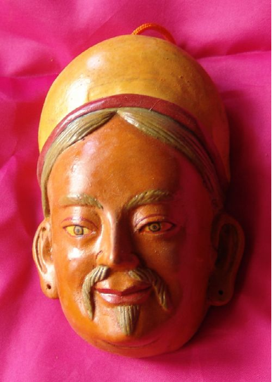 泥塑面具的制作也很有講究:“首先要將面具模型徹底風(fēng)干,然后在表面敷上摻有液體樹膠和面粉熬制而成的糨糊,再用一小塊布將風(fēng)干好的模子包好裹嚴(yán),接著要敷一層柴薪混合物,同樣用另一塊布把泥模包實(shí),反復(fù)四五次后,將模子放好讓它自然干透。這些步驟做完后,要用一根棍子敲打出包在里面的泥模,這樣就形成了布、樹、膠和面粉做成的一種面具。當(dāng)然,做好后還要進(jìn)行彩繪、涂清漆,這樣才能讓一個(gè)面具光彩奪目?!边叞驼f道。