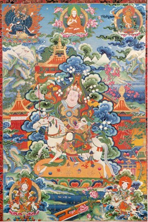 勉塘畫派是15世紀(jì)以后影響最大的繪畫流派,主要流行于衛(wèi)藏地區(qū)及昌都部分地區(qū)。該畫派的創(chuàng)始人是勉拉頓珠,他出生于洛扎勉塘(今山南地區(qū)),勉塘畫派由此而得名。他大約出生于公元十五世紀(jì)20年代或30年代。據(jù)史料記載,勉拉頓珠出生的時(shí)間正好與他家鄉(xiāng)發(fā)現(xiàn)了朱砂礦的時(shí)間一致。這種重要繪畫顏料的出現(xiàn),預(yù)示著一代繪畫大師降臨人世。他自幼聰慧,毫不費(fèi)力地學(xué)完各種字體的書寫、大小五明中的絕大多數(shù)內(nèi)容。成年后,拜后藏一帶的著名美術(shù)大師多巴扎西杰布為師,苦心鉆研,在繪畫藝術(shù)領(lǐng)域取得了很深的造詣。通曉了藏、漢、印、尼泊爾等各種繪畫派別的技法,他根據(jù)《續(xù)部》等編寫了繪畫理論專著《造像量度如意寶》,并創(chuàng)立了勉塘畫派。他參與了一世達(dá)賴?yán)锔刂彀团c1447年創(chuàng)建的扎什倫布寺措欽大殿壁畫繪制工程的全過程,單獨(dú)完成了北壁的《釋迦牟尼與十六羅漢圖》與《八十大成就者環(huán)圍金剛持》兩幅壁畫,在西壁勉拉頓珠親手繪制了《釋迦牟尼十二宏化圖》的白描部分。另外在該寺以及同時(shí)代建造的諸多廟宇繪制完成了大量的壁畫、巨幅堆秀唐卡及小型唐卡。其中最負(fù)盛名的是扎什倫布寺的巨幅堆秀唐卡《釋迦牟尼》,其大小約為長32.9米、 寬19.3米。該畫派造像法度精嚴(yán),與傳統(tǒng)的表現(xiàn)手法相比,尤其注重線條的運(yùn)用,線條工整流暢,色調(diào)活潑鮮亮,變化豐富,人物體態(tài)、骨相和肌膚都異常完美,脖頸較長,高度和諧的色彩和色調(diào)的配制十分突出。畫面暈染充分,用色細(xì)膩、柔和、富麗堂皇。由于石青和石綠色突出,從遠(yuǎn)處看,繪畫作品十分優(yōu)美和靜。衣袍和飾帶呈不對(duì)稱形式,棋格使構(gòu)圖消失,諸神位于云端風(fēng)景之中,布局活躍多變,背光中卷草圖案等變成了波浪式放射的金線,該派擅長表現(xiàn)和靜類神像。