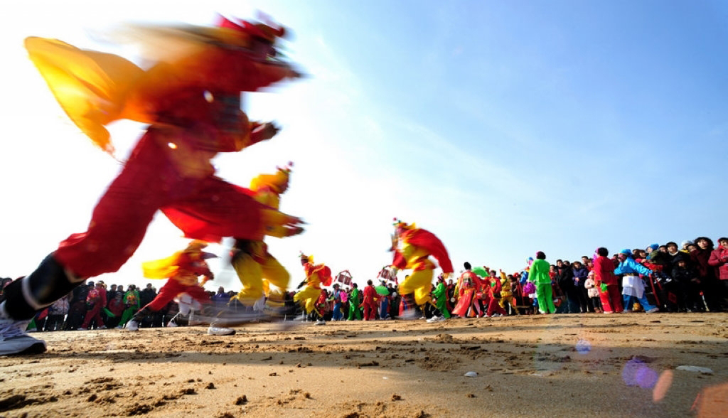 秧歌是春節(jié)群眾歡慶活動(dòng)中,起著承前啟后、烘托氣氛的大型歌舞形式。這里所指的“秧歌”不僅是單一的“秧歌舞”,而是包含著數(shù)十種歌舞形式所組合的文藝演出隊(duì)伍。這支隊(duì)伍既要在走街串巷中做行進(jìn)表演,又將最后集中于廣場做正式的歌舞演出。因此在北方,人們索性就把過去有著祭祀色彩,而今完全成為春節(jié)娛樂式的民間文藝形式稱為“社火”或“秧歌”,把這支浩蕩的隊(duì)伍統(tǒng)稱為“秧歌隊(duì)”。秧歌隊(duì)最前方,在高舉象征來年風(fēng)調(diào)雨順大傘的藝人率領(lǐng)下,“龍舞”“獅舞”舞隊(duì)位列隊(duì)首;接下來是一組手揮彩綢翩翩起舞,走“雙葫蘆”“繞菠花”各種圖案的“大場”表演隊(duì);然后是腰間橫挎紅色腰鼓、踏著激越鼓聲的“腰鼓隊(duì)”,表演著令人眼花繚亂的“回頭望月”等套路;再后面是腰系竹馬或旱船,扮演新郎送媳婦回娘家的“跑驢”或“跑旱船”;接著是腳踩丈八高蹺、穿戲裝、彩繪臉譜的“高蹺隊(duì)”。接下來還有名為《火盆架子》的隊(duì)伍,那是把冬季用于取暖的炭盆架,用繩子將其高于腳面懸掛在肩上。盆架以綢布、花草裝飾,表演者戲裝打扮,表演一段段膾炙人口的戲曲節(jié)目。他們被歡天喜地、熙熙攘攘的人們擁簇著一同前往最后進(jìn)行表演的廣場。由各個(gè)村鎮(zhèn)陸續(xù)舉行的這種熱烈而歡騰的歌舞慶祝形式,將貫穿在整個(gè)春節(jié)期間,直到正月十五“燈節(jié)”。
