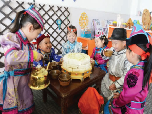 走進(jìn)錫林郭勒盟鑲黃旗民族幼兒園,“賽白努,請(qǐng)坐、喝茶”等文明禮貌用語讓我們聽得無比親切。該幼兒園2009年開始開展“傳承蒙古族文化遺產(chǎn)”的課程。據(jù)了解,課程的內(nèi)容按照日常生活的習(xí)慣來展開故事情節(jié)。舞蹈、繪畫,都從幼兒的角度去設(shè)計(jì),結(jié)合幼兒喜歡的童話故事、卡通圖片,將蒙古族文化滲透其中。課外要求家長(zhǎng)帶領(lǐng)孩子走進(jìn)牧區(qū)參加放牧、擠奶、接羔等勞動(dòng),從長(zhǎng)輩那里學(xué)習(xí)繼承生產(chǎn)生活方式和技能。蒙古象棋、“吉日格”(鹿連兒)、“沙嘎”(羊拐子)等一些蒙古族傳統(tǒng)游戲不僅是智慧、意志和應(yīng)變能力的較量,更重要的是使民族的文化遺產(chǎn)得以傳承。